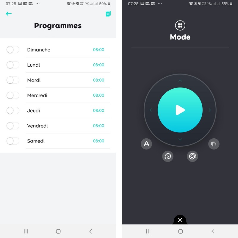 Il est possible de programmer le nettoyage une fois par jour, et lorsque l'opération va se déclencher, le robot va reprendre automatiquement le dernier mode utilisé. Il est à noter que l'application ne propose pas de consulter l'historique des nettoyages, avec la durée associée. C'est dommage, notamment pour avoir des repères quant à la maintenance de l'appareil.