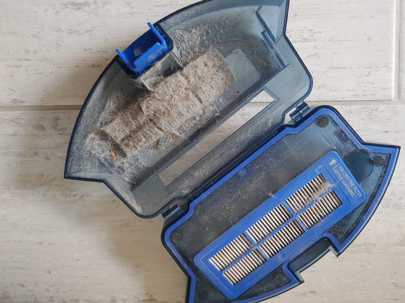 Au niveau de la navigation, il gère assez bien les meubles et les obstacles. Parfois, il s'arrête à temps et ne touche même pas l'obstacle, alors que de temps en temps il cogne l'obstacle, et ensuite il le contourne. En soi, pour ce type d'appareil, c'est normal que la navigation s'effectue de cette façon. Le nettoyage quant à lui est bien réalisé malgré que ce soit long et l'aspiration est efficace, en témoigne le bac à poussière ci-dessous.