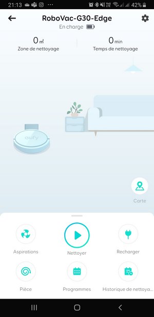 Ce robot propose deux modes de nettoyage : le mode automatique et le nettoyage localisé. Avec sa puissance confortable de 2000 Pa, il confirme la bonne impression de son prédécesseur le RoboVac 30C en réalisant un nettoyage de qualité. C'est deux robots s'y prennent différemment, celui-ci va générer une carte en fonction du circuit réalisé et l'aperçu est disponible en temps réel sur l'application Eufy Home. L'application affichera également le temps écoulé depuis que l'aspirateur a commencé le nettoyage ainsi que la surface nettoyée en m². La carte générée permet de se rendre compte que le robot nettoie bien toute la zone.