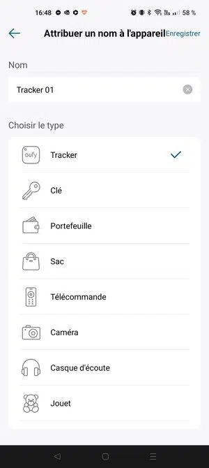 - Chaque tracker peut bénéficier d'un nom personnalisé et être associé à un type d'objet, ce qui sera pratique pour s'y retrouver entre vos différents trackers.