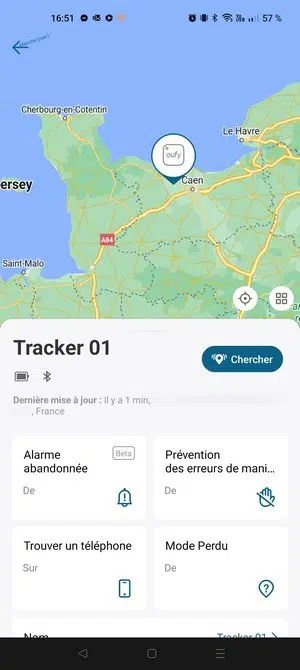 - La localisation où une carte affiche la dernière position connue du tracker, et donc, en principe, de l'objet auquel il est accroché.