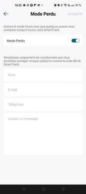 - Le "Mode Perdu" qui vous offre la possibilité de renseigner vos coordonnées et un message personnalisé : si quelqu'un retrouve votre objet, il lui suffira de scanner le QR Code au dos du tracker pour afficher vos coordonnées.