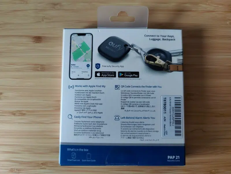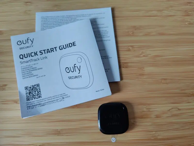 Le packaging soigné d'Eufy Security nous donne un aperçu sur le design du tracker ainsi que sur ses caractéristiques. Le tracker est accompagné par un guide de démarrage rapide.
