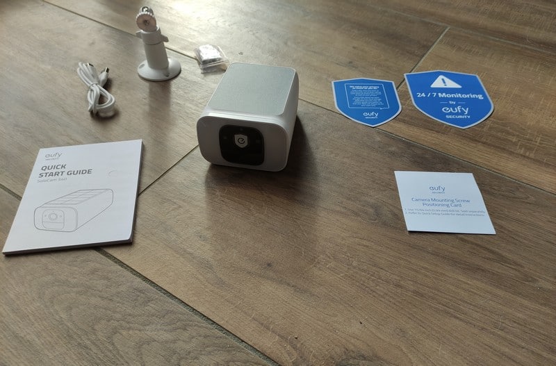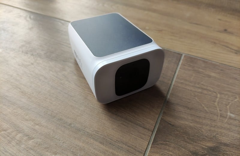 Concernant le design, pas de dépaysement, nous retrouvons le noir et blanc habituel de la marque. Sur la face avant, nous retrouvons dans la partie noire l’objectif de la caméra, le détecteur de mouvement, le capteur photosensible, le microphone et un voyant LED. Le panneau solaire est situé sur le dessus, plutôt logique 😊. Le haut-parleur se trouve en dessous.