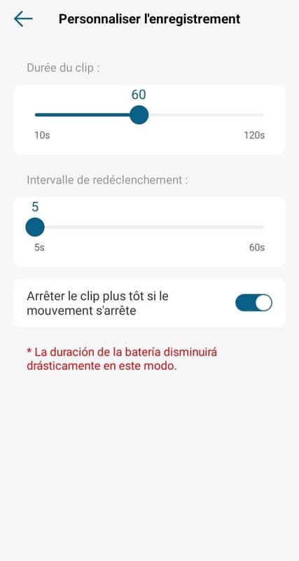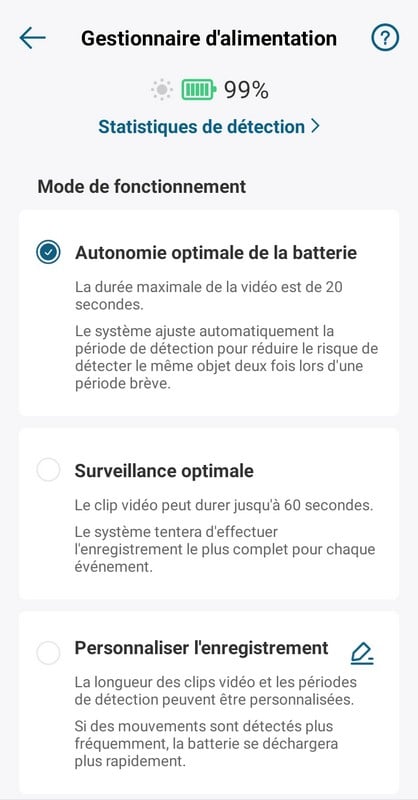 Selon le constructeur, seules 2 heures par jour d’exposition direct au soleil suffisent pour que la caméra soit alimentée en continu. Malgré le fait que je n’ai pas respecté les préconisations d’installation de la caméra (avec le toit du garage qui recouvre un peu le panneau), le niveau de la batterie ne descend presque pas, et je suis régulièrement proche des 100% alors que la caméra est en place depuis plusieurs semaines. Un gestionnaire d’alimentation est disponible depuis l’application : il offre la possibilité de régler la durée et l’intervalle de déclenchement de l’enregistrement.