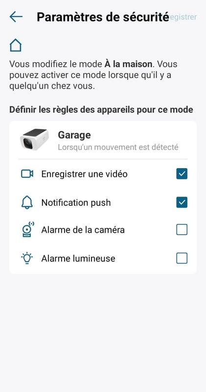 Vous pouvez également déclencher la sirène, allumer le projecteur, commencer un enregistrement ou ne rien faire. Ces paramètres sont modifiables dans les modes de sécurité. Il y a deux modes préconfigurés, le mode "A la maison" et "Absent", mais vous pouvez créer et personnaliser les vôtres. Voici les paramètres sur lesquels vous pouvez agir: