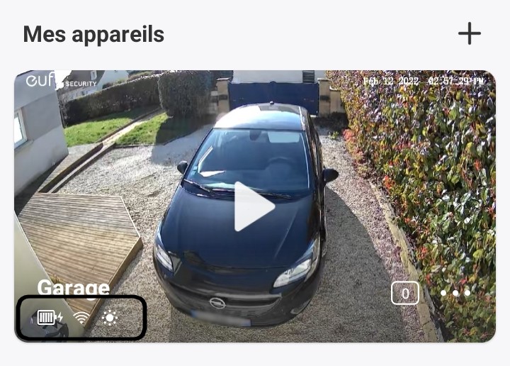 Des informations sous forme d’icône nous donnent le niveau de batterie, la puissance du signal wifi et le niveau d’exposition au soleil de la caméra. Le soleil a son importance pour recharger la caméra.