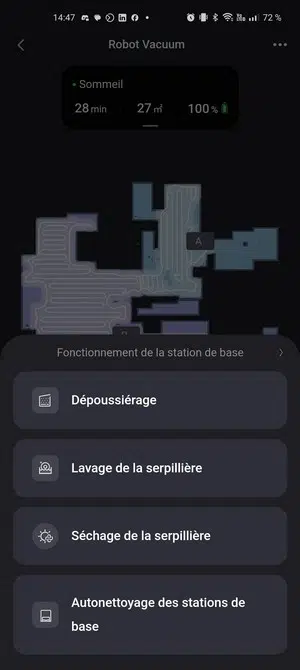 L'application intègre plusieurs boutons d'action pour déclencher des opérations sur la station de charge : sécher les serpillières, laver les serpillières, vider le réservoir à poussière du robot et l'autonettoyage de la station elle-même.