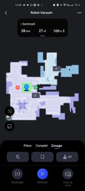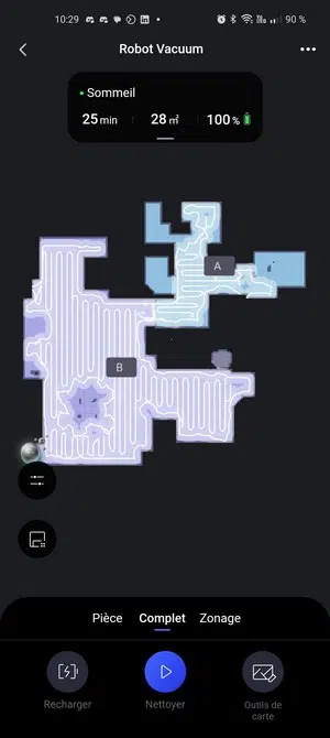- Suivi de la progression du robot en temps réel sur la carte lorsqu'un nettoyage est en cours.