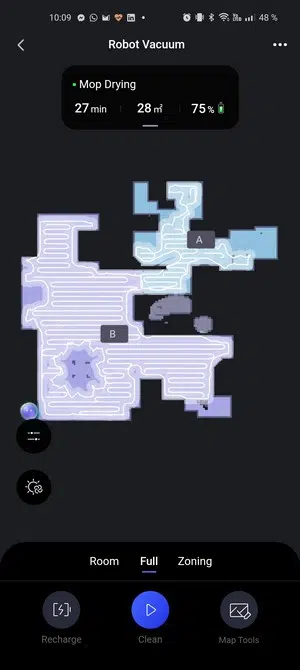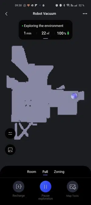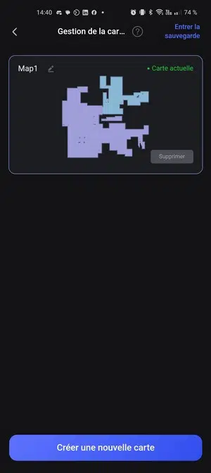 Le système de cartographie joue un rôle clé dans l'utilisation d'un robot laveur de sol. Le modèle Eureka J12 Ultra n'échappe pas à cette règle. La carte générée manque de précisions, car comme le montre les images ci-dessous, il y a énormément d'angles et de coins : ce qui ne reflète pas la forme exacte des pièces du logement, mais plutôt la position des meubles... Néanmoins, Eureka a intégré toutes les fonctionnalités nécessaires :