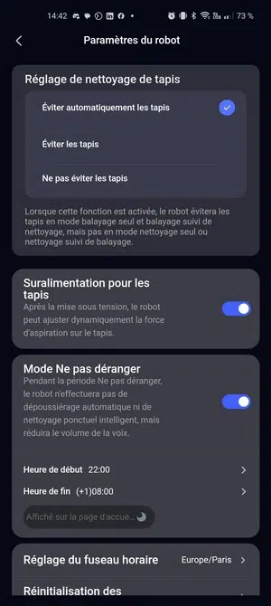 - Gestion des tapis : le robot doit-il éviter les tapis ou doit-il passer dessus ? À vous de choisir. Il y a aussi une option pour augmenter la puissance d'aspiration sur les tapis.