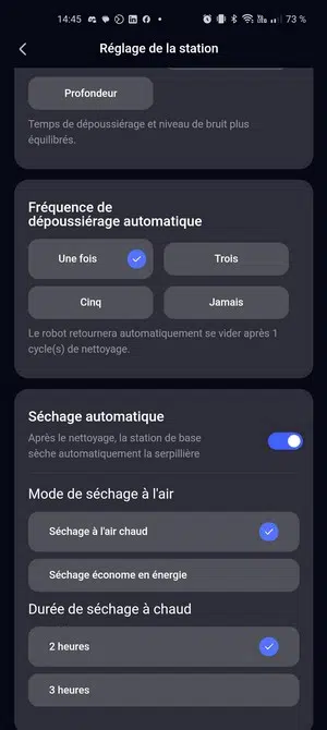 - Configuration du séchage automatique : lorsque la station va sécher les serpillières, à la fin de la session de nettoyage, doit-il effectuer un séchage à l'air chaud ou air ambiant ? Pendant combien de temps : 2 heures ou 3 heures ?