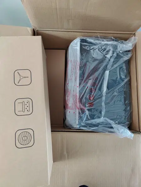 Au sein du carton lourd et imposant, nous retrouvons la station de charge, le robot et les accessoires. Le robot est stocké dans une boite cartonnée dédiée, tout comme les accessoires, tandis que la station est emballée dans un plastique. L'ensemble est bien calé, chaque élément est à sa place et le matériel me semble suffisamment protégé pour résister au transport.