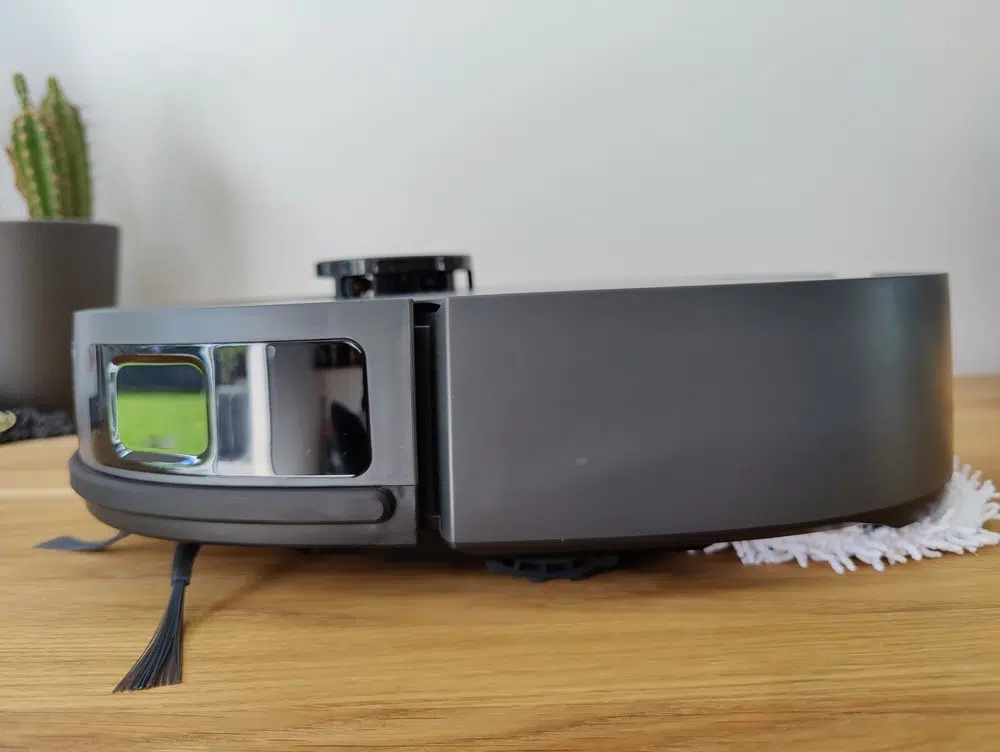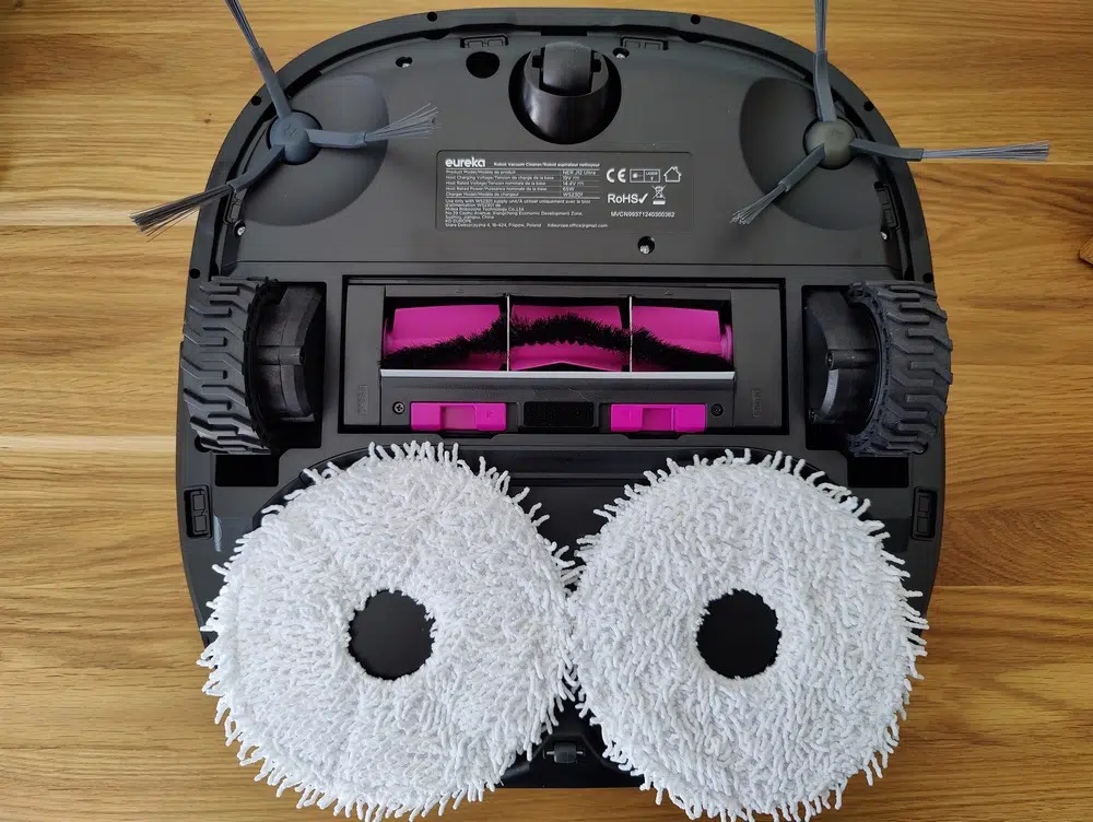 Le dessous de l'appareil donne un aperçu des différentes brosses ainsi que des serpillières rotatives. D'ailleurs, sachez que ces serpillières très épaisses effectuent 200 rotations par minute lorsque le robot nettoie votre sol. C'est plus que la majorité des robots, où le nombre de rotations par minute habituel est de 180.
