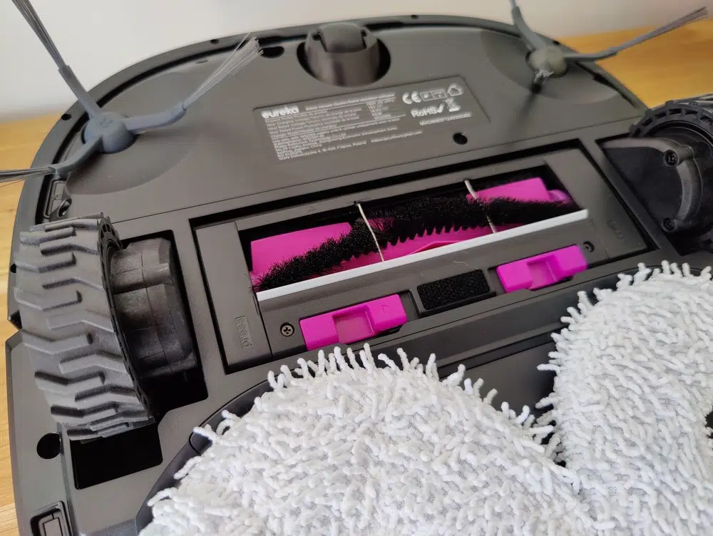La présence de deux brosses latérales est également un plus pour ramener vers le robot un maximum de poussière et autres saletés. Le robot est équipé d'une brosse centrale anti-emmêlement. Enfin, grâce à ses roues principales, le robot est capable de passer des obstacles d'une hauteur maximale de 2 cm (c'est la norme sur les robots).