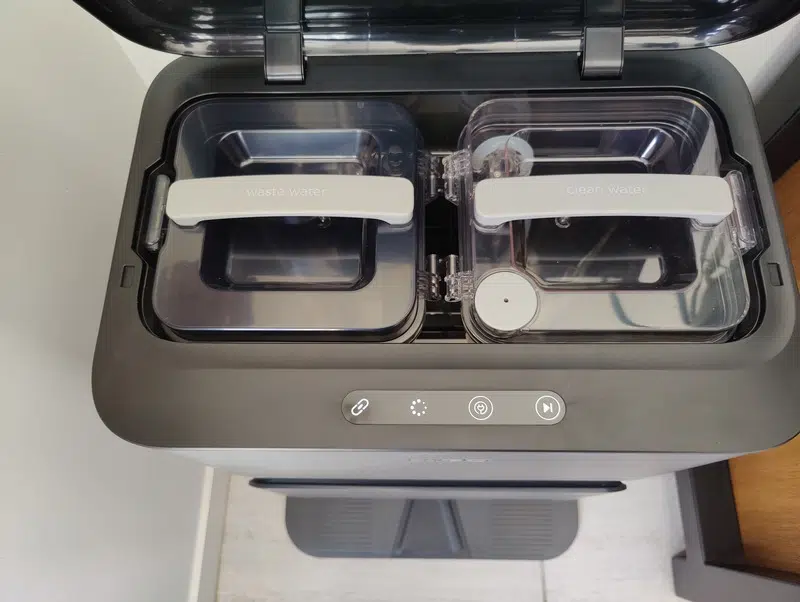 La station de charge est équipée de 2 réservoirs de chacun 4.6 litres. Il y a un réservoir destiné à collecter les eaux usées et un réservoir qu'il convient de remplir d'eau froide. Une poignée présente sur le dessus de chaque réservoir permet de le manipuler facilement, notamment pour le retirer de la station ou le remettre en place.