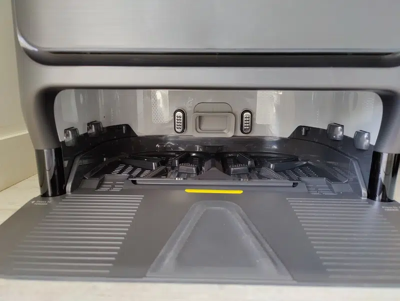 Enfin, le plateau inférieur de la station de charge, est totalement amovible. Ceci est un très bon point pour faciliter le nettoyage de la station de charge sans devoir se plier en quatre. Il suffit de déclipser le réceptacle afin de pouvoir le nettoyer aisément : étant donné que les serpillières seront nettoyées ici, et malgré la fonction d'auto-nettoyage, ceci pourra s'encrasser avec le temps.