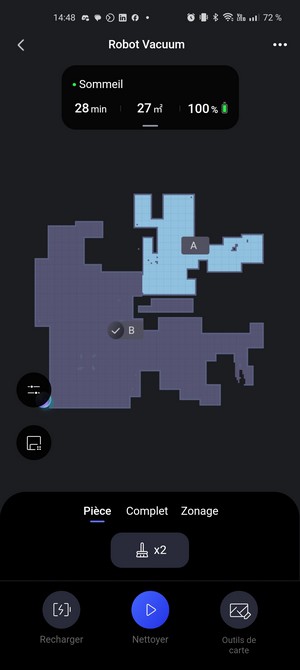 Chaque session de nettoyage est personnalisable c'est-à-dire que nous pouvons ordonner au robot de nettoyer 1 fois, 2 fois ou 3 fois. Nous pouvons aussi ajuster la puissance de l'aspiration ainsi que la fréquence de nettoyage des serpillières (ce qui implique un retour à la station). Le robot peut aussi aspirer et laver en un seul passage, ou procéder en deux temps, voire même ne faire qu'un seul type de nettoyage.
