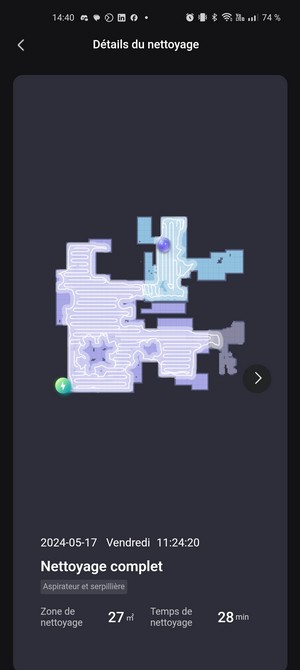 - Historique du nettoyage : liste de toutes les sessions de nettoyage du robot, avec un aperçu de son trajet, de la durée de la session, etc.