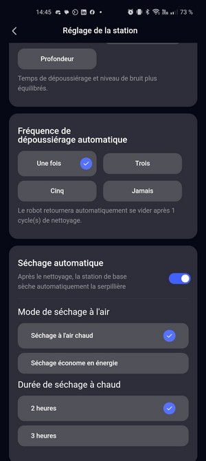 - Configuration du séchage automatique : lorsque la station va sécher les serpillières, à la fin de la session de nettoyage, doit-il effectuer un séchage à l'air chaud ou air ambiant ? Pendant combien de temps : 2 heures ou 3 heures ?