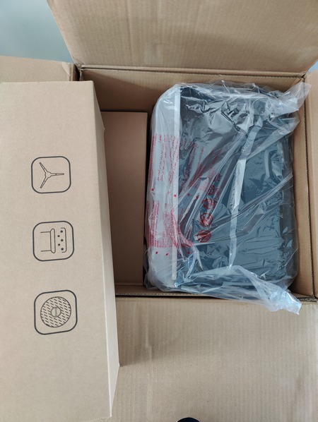 Au sein du carton lourd et imposant, nous retrouvons la station de charge, le robot et les accessoires. Le robot est stocké dans une boite cartonnée dédiée, tout comme les accessoires, tandis que la station est emballée dans un plastique. L'ensemble est bien calé, chaque élément est à sa place et le matériel me semble suffisamment protégé pour résister au transport.