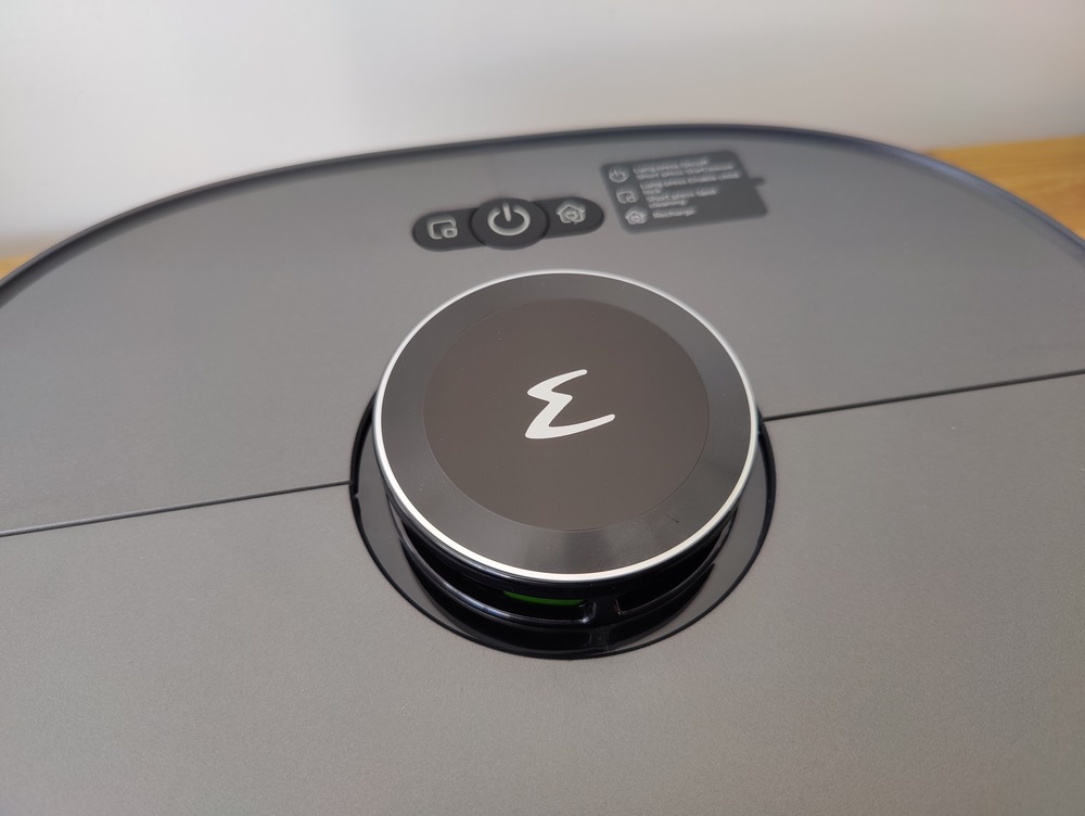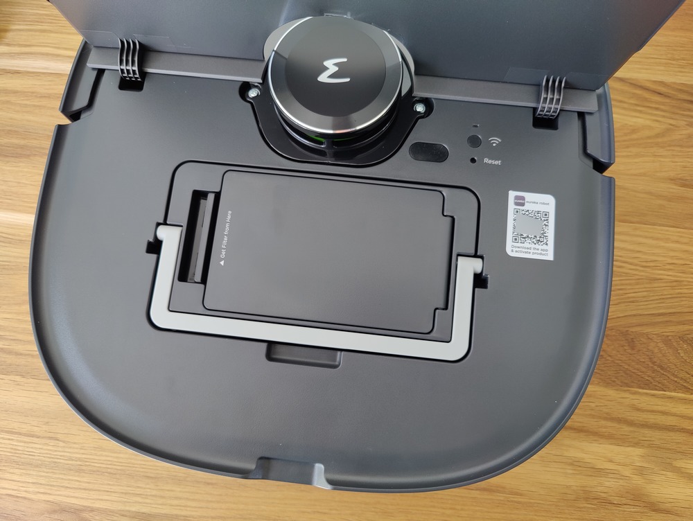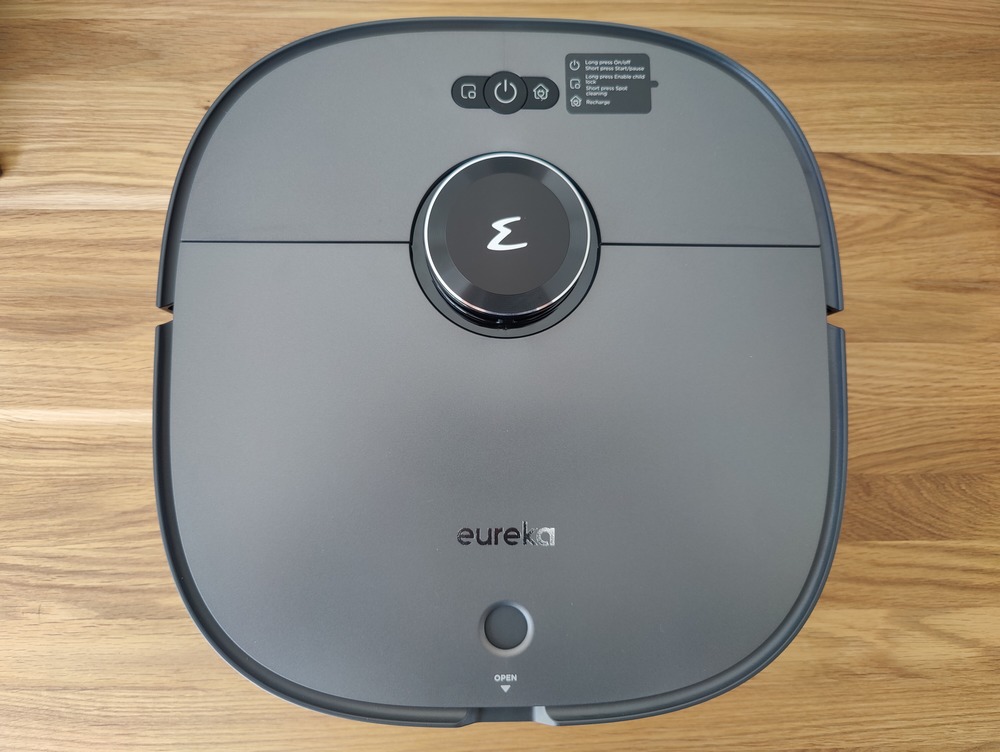 Le dessus du robot est surplombé par le système de navigation LiDAR, identifiable grâce à la tourelle estampillée avec le "E" de la marque Eureka. Un peu plus haut, sur la coque, le robot est équipé de trois boutons. Ils donnent accès à plusieurs fonctions : démarrer, reprendre, mettre en pause le nettoyage / revenir à la base / démarrer le nettoyage localisé / gérer le verrouillage enfants. Enfin, un couvercle donne accès au réservoir à poussières, ainsi qu'aux boutons Wi-Fi et reset.