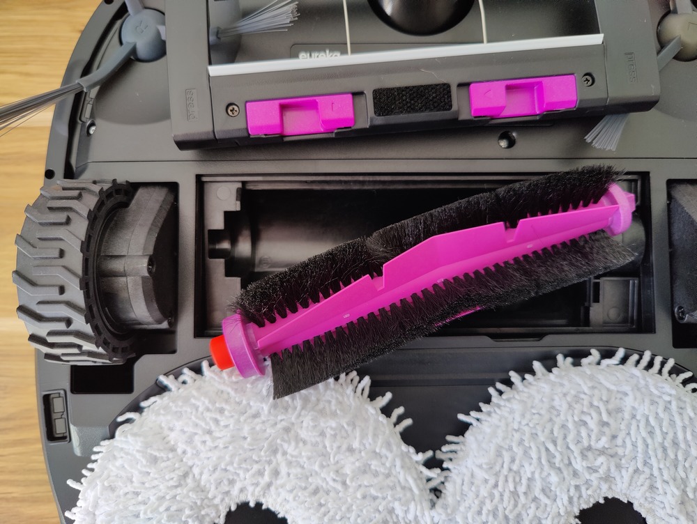 La présence de deux brosses latérales est également un plus pour ramener vers le robot un maximum de poussière et autres saletés. Le robot est équipé d'une brosse centrale anti-emmêlement. Enfin, grâce à ses roues principales, le robot est capable de passer des obstacles d'une hauteur maximale de 2 cm (c'est la norme sur les robots).
