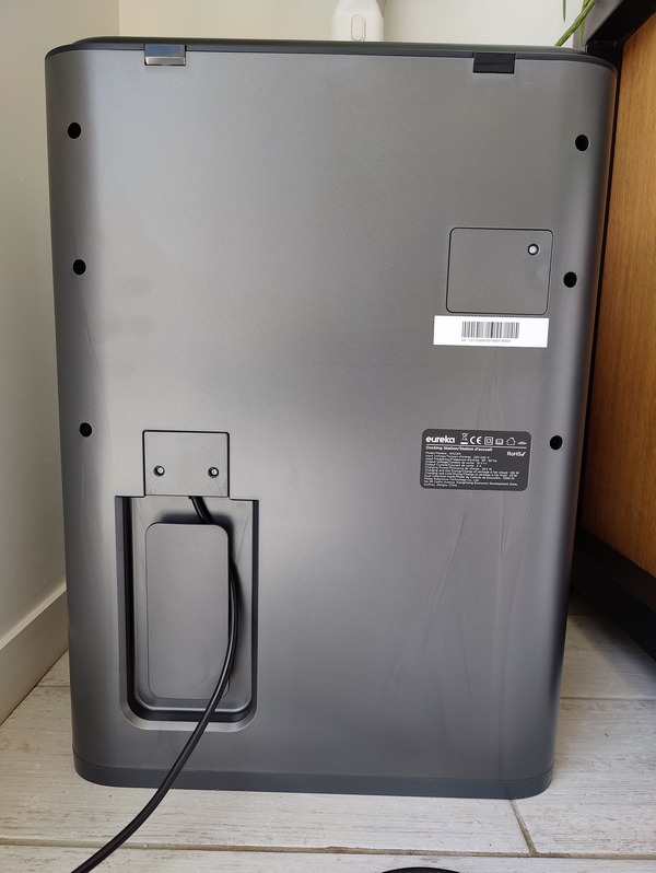L'installation s'effectue en quelques minutes puisqu'il suffit de déballer le matériel, de retirer les différentes protections et d'installer la base ainsi que le robot. Le câble d'alimentation se connecte à l'arrière de la base et le surplus de câble peut être enroulé à l'arrière, de façon à faire une installation propre. Concernant le choix de l'emplacement du robot, sachez qu'Eureka demande 5 cm d'espace libre à droite et à gauche, ainsi que 1.3 mètre devant la station.