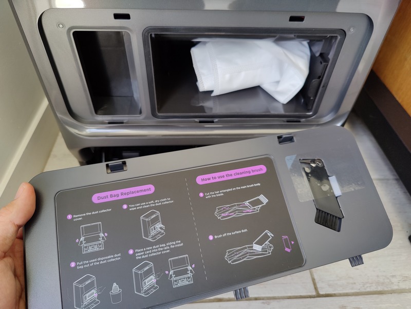 Enfin, le plateau inférieur de la station de charge, est totalement amovible. Ceci est un très bon point pour faciliter le nettoyage de la station de charge sans devoir se plier en quatre. Il suffit de déclipser le réceptacle afin de pouvoir le nettoyer aisément : étant donné que les serpillières seront nettoyées ici, et malgré la fonction d'auto-nettoyage, ceci pourra s'encrasser avec le temps.