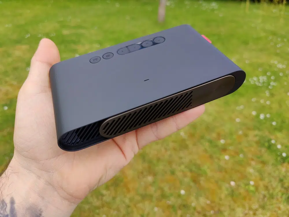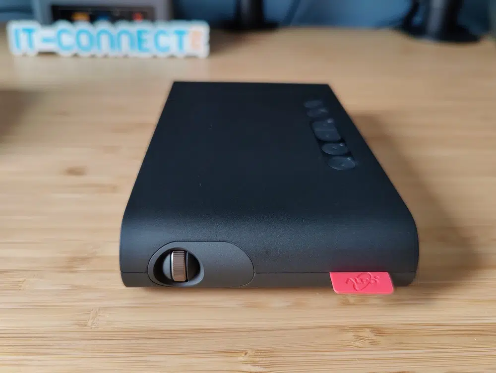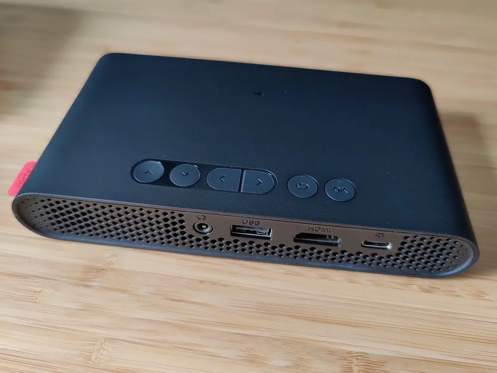 Sur le dessus du vidéoprojecteur de poche, il y a les boutons. Au nombre de six, ces boutons vont permettre de naviguer dans les menus et l'interface du projecteur, notamment parce qu'il n'y a pas de télécommande. Ils vont permettre également de gérer le volume. Ces boutons sont accompagnés par un voyant lumineux très discret qui s'illumine lorsque l'appareil est sous tension. Sur le côté gauche se situe la partie haut-parleur tandis que sur la droite, nous retrouvons une molette pour gérer le focus de l'image. Enfin, en dessous, nous avons le droit à 3 petits patins (1 mm) qui malheureusement ne sont pas antidérapants.