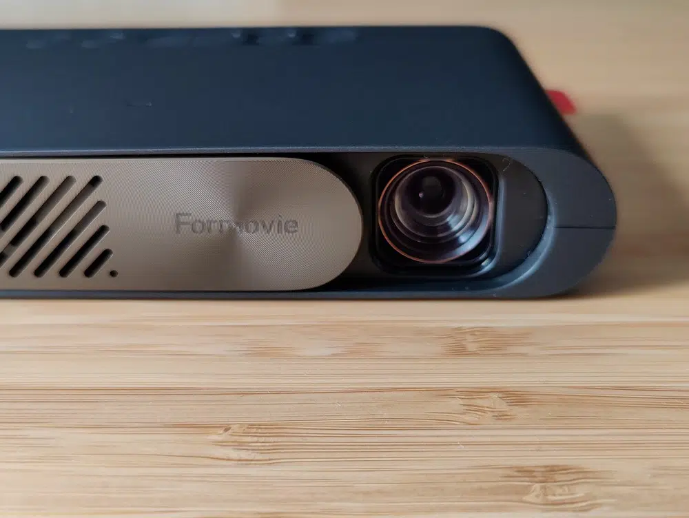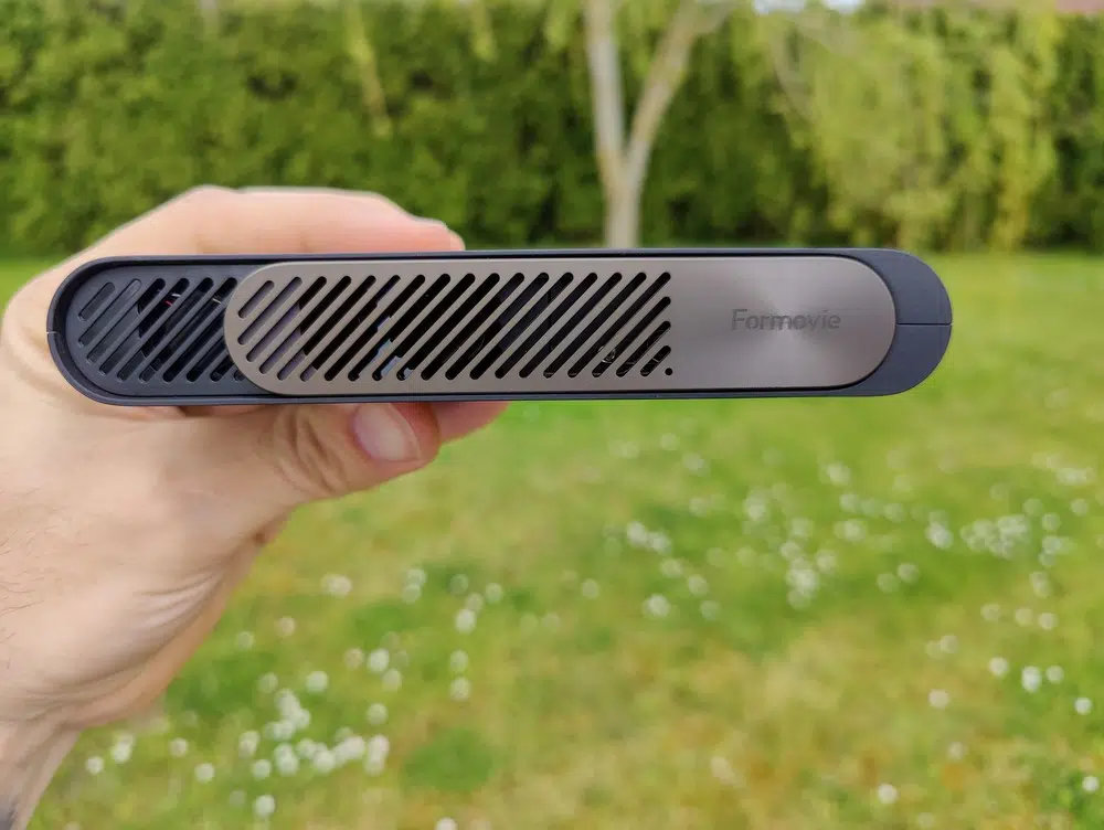 Le boitier du Formovie P1 est entièrement en plastique, de couleur noire à part la façade coulissante qui est de couleur bronze et qui permet de protéger ou masquer la lentille du vidéoprojecteur. Sur la partie gauche de la façade s'effectue la ventilation, avec la présence d'un petit ventilateur. La ventilation s'effectue aussi par l'arrière de l'appareil, où l'on retrouve les 4 ports : Jack, USB-A, HDMI et USB-C.