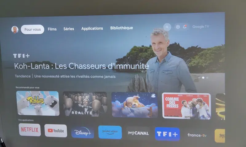 Lors du premier lancement, le vidéoprojecteur nous invite à effectuer la configuration. Pour avoir une meilleure expérience et accéder à l'intégralité des fonctionnalités, il est préférable d'effectuer la configuration via Google TV. Avec Google TV, vous avez une intégration complète de vos services préférés, avec des recommandations personnalisées, les dernières nouveautés, etc... Ce qui permet d'enrichir l'expérience.