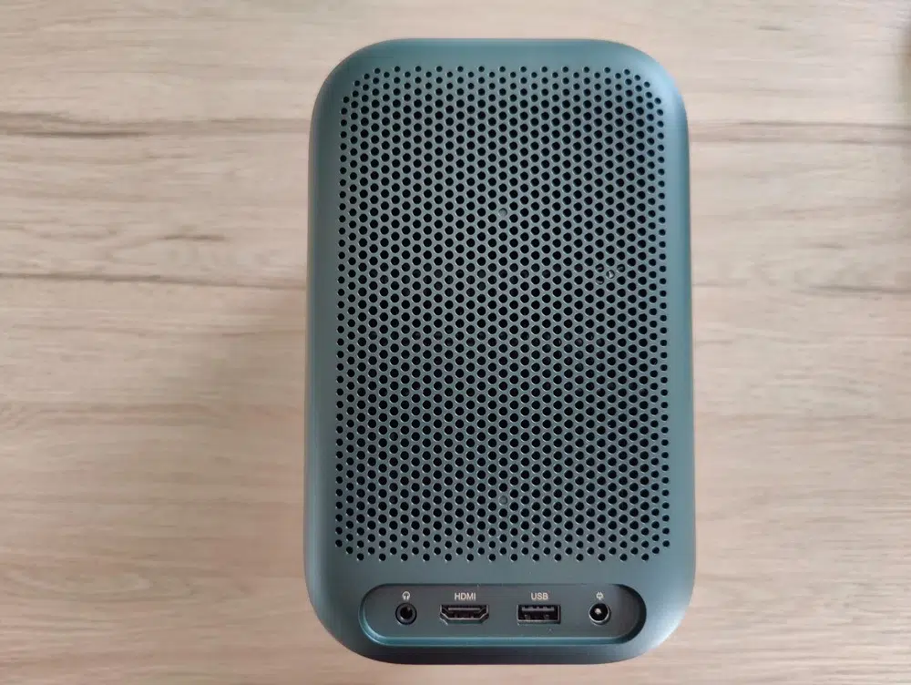 Nous pouvons constater que ce vidéoprojecteur est équipé d'un port Jack, d'un port HDMI et d'un port USB. Ils sont situés à l'arrière du boitier, sur la partie basse. Le boitier est bien aéré, ce qui permet d'éviter que l'appareil chauffe, mais c'est également utile pour la diffusion de l'audio. Pour bien tenir en place, ce boitier intègre 4 patins antidérapants.