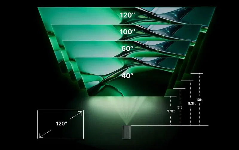 L'image de ce vidéoprojecteur peut être comprise entre 40 et 120 pouces, en fonction de la distance entre le vidéoprojecteur et le mur. Pour être plus précis, 40 pouces correspond à une diagonale de 101 cm, tandis que 120 pouces correspond à environ 3 mètres de diagonale. Ceci est important, car si le recul n'est pas suffisamment important, la mise au point automatique ne parviendra pas à ajuster l'image correctement.