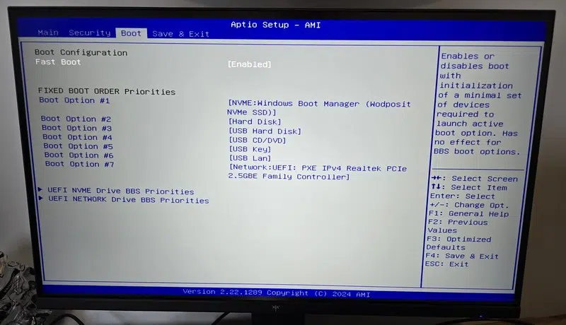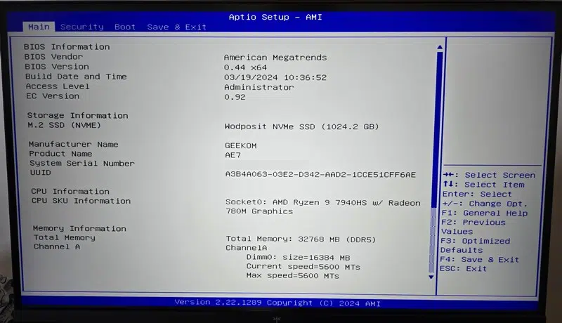 Commençons par nous intéresser au BIOS AMI du Geekom AE7. Comme pour d'autres modèles de la marque, nous avons le droit à un BIOS très léger, c'est-à-dire qu'il n'y a pas beaucoup d'options de configuration à notre disposition. Nous pouvons malgré tout configurer le ventilateur, ece qui a son importance. Bien entendu, ce mini PC supporte la virtualisation ainsi que le boot réseau (PXE).