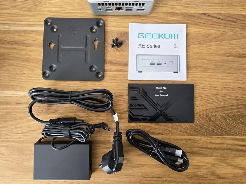 Voici les éléments inclus par Geekom : un Mini PC AE7, un câble HDMI, une alimentation externe et son câble, une plaque VESA (et les vis) permettant d'accrocher le mini PC à l'arrière d'un écran (support VESA), une notice (qui explique comment ajouter un disque, comment utiliser le support VESA, etc.), ainsi qu'une lettre de remerciement pour l'achat. Un kit complet et conforme aux habitudes de la marque.
