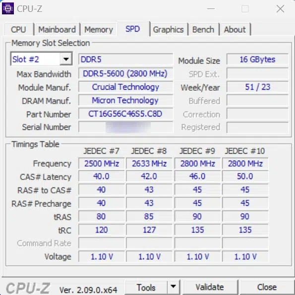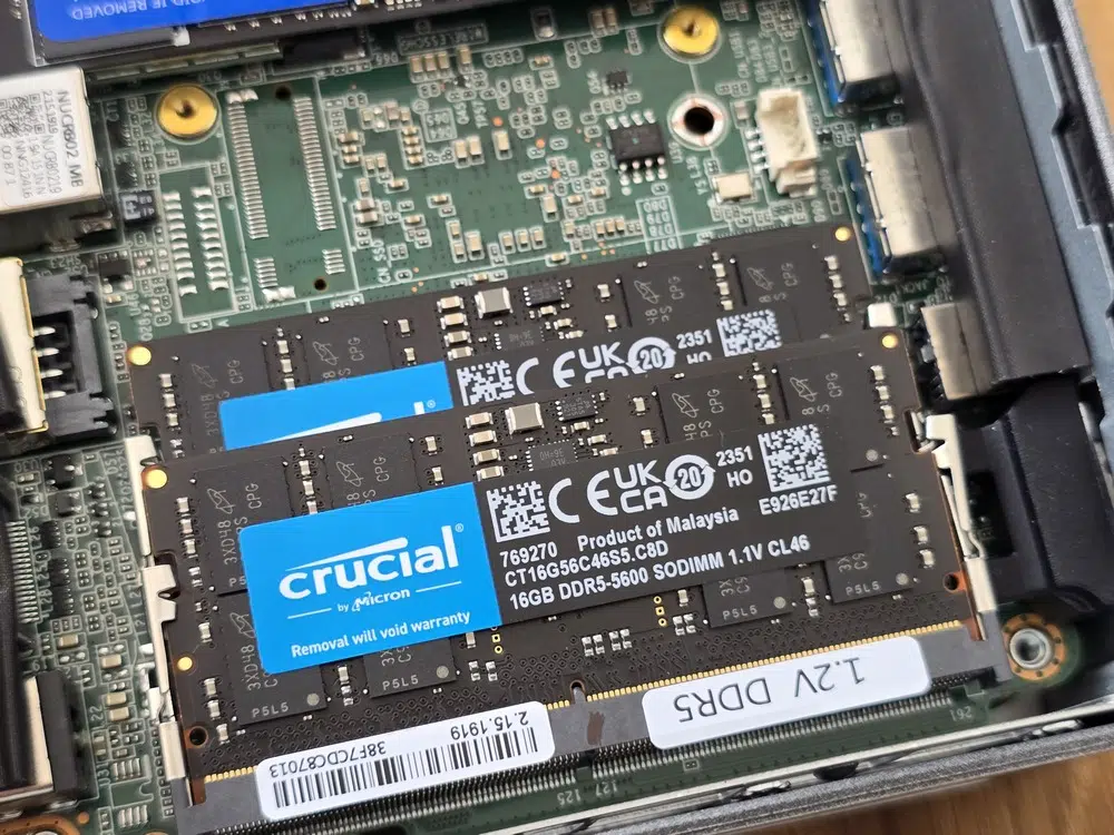 - Deux barrettes de RAM de marque Crucial : 16 Go DDR5-5600 SODIMM. Soit 32 Go au total.