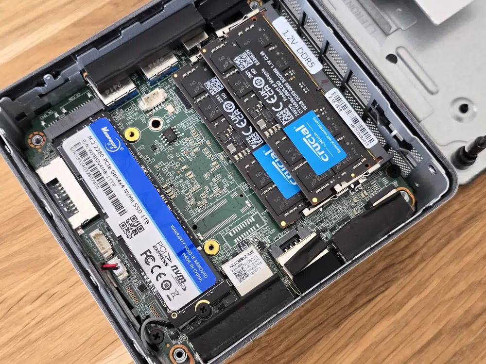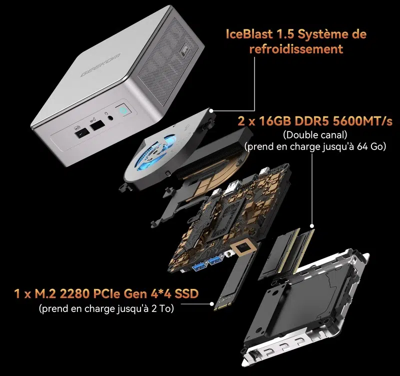 Le mini-PC est livré avec 32 Go de RAM en DDR5, mais une mise à niveau est possible puisque ce mini PC supporte une mise à niveau à 64 Go. Néanmoins, vous devrez remplacer les 2 barrettes de RAM actuelles puisque les 2 slots sont occupés.