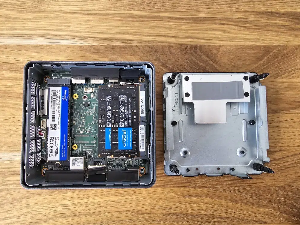 Comme je l'évoquais précédemment, le boitier s'ouvre facilement puisqu'il y a seulement 4 vis à retirer et elles sont directement accessibles. C'est l'occasion de jeter un coup d'œil à l'intérieur du boitier et de faire connaissance avec le SSD et la RAM.