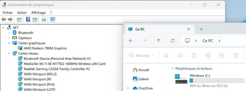 À première vue, il s'agit d'une image officielle de Windows 11 Pro qui n'a pas été personnalisée par Geekom. Nous retrouvons uniquement les applications natives ajoutées par Microsoft. L'occasion d'aller faire un tour dans la liste des périphériques pour obtenir des informations sur les cartes réseaux :