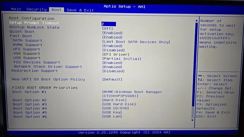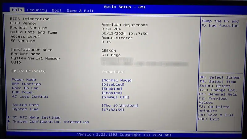 Commençons par évoquer le BIOS AMI, puisque nous pouvons accéder à ses options avant d'arriver sur le système d'exploitation. Il reste très minimaliste, comme souvent chez Geekom, et nous sommes loin de certaines interfaces modernes. Nous avons la main sur la gestion de certaines fonctions comme l'alimentation USB, le Wake on LAN (WOL), les fonctions de démarrage ainsi que la possibilité de définir un mot de passe pour protéger l'accès au BIOS. La virtualisation est aussi prise en charge par ce modèle, bien entendu.