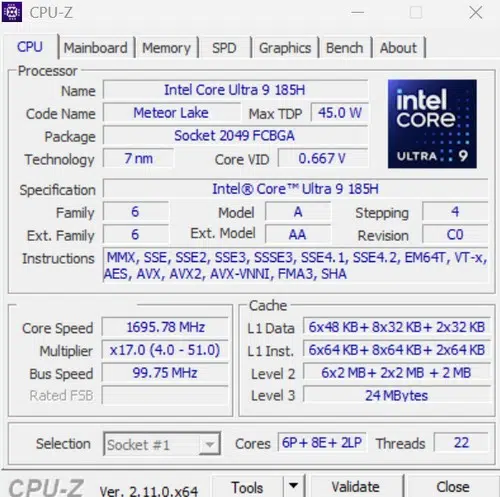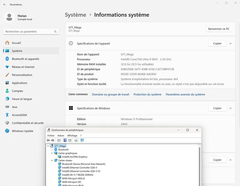 - Processeur : Intel Core Ultra 9-185H (16 Cœurs, 22 Threads, 24 Mo de cache, jusqu'à 5,10 GHz - TDP 45W)