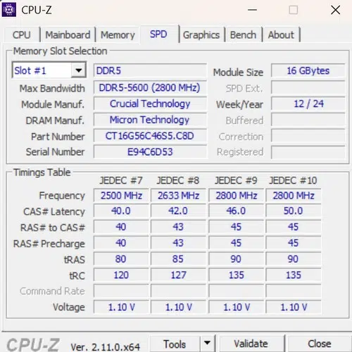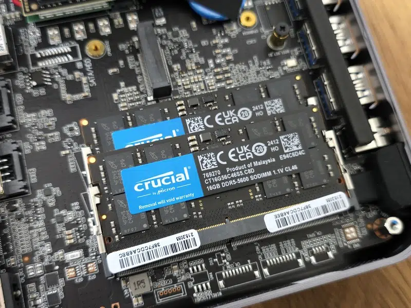 - Deux barrettes de RAM de marque Crucial : 16 Go DDR5-5600 SODIMM 1.1V CL46. Soit 32 Go au total.