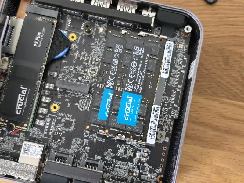 Une fois l'opération effectuée, nous pouvons apercevoir les composants choisit par Geekom, dont la RAM et le disque NVMe. Ici, nous avons du matériel de chez Crucial :
