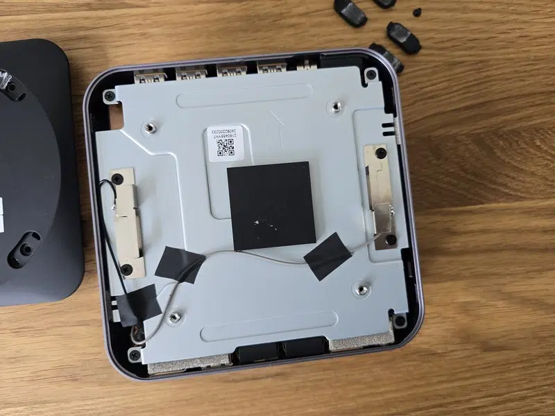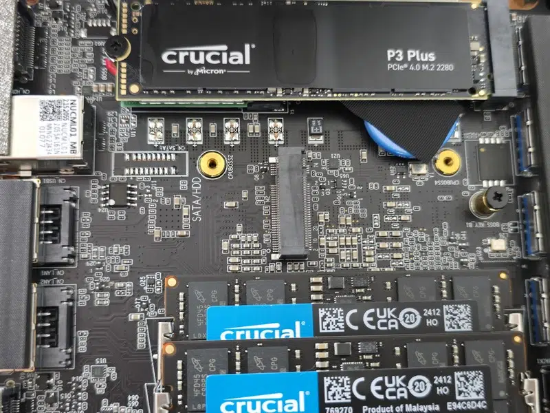 - Un SSD NVMe de marque Crucial, avec la référence P3 Plus, d'une capacité de 2 To est présent dans le boitier. Un pad thermique a été positionné sur le SSD, par Geekom (il est collé directement sur le support métallique). C'est un modèle vendu environ 125 euros sur Amazon.fr.