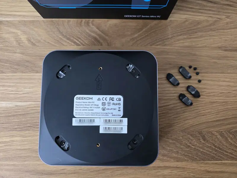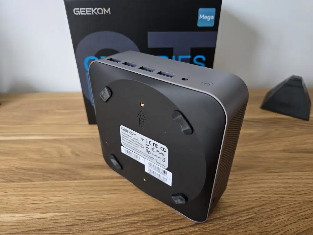 Le dessus du boitier arbore l'habituelle marquage chromé "GEEKOM". Si nous jetons un coup d'œil au-dessous du mini PC, nous verrons un socle en plastique sur lequel se situe des étiquettes avec diverses informations telles que le modèle, les adresses MAC, ou encore le numéro de série.