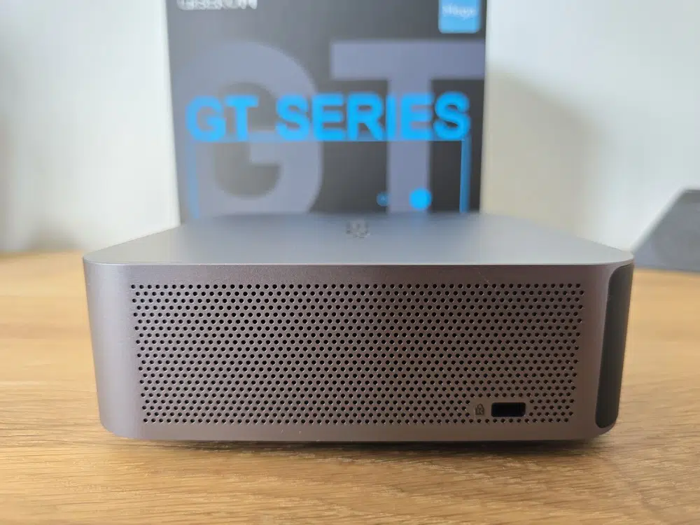 Ce mini PC hérite d'un boitier aluminium avec des coins arrondis, semblable à celui du GT13 Pro. De couleur gris anthracite, l'esthétique de ce boitier est réussie et il aspire confiance. Vous remarquerez tout de même une partie en plastique noire, à l'arrière du boitier, là où se situent tous les ports.