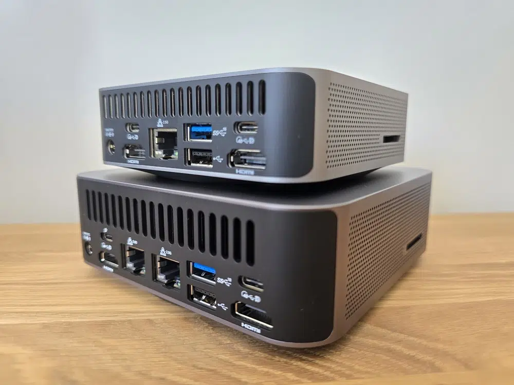 Néanmoins, le GT1 Mega est plus imposant que ses ainés de la série GT de chez Geekom. La différence est notable comme le montre les photos ci-dessous où le Geekom GT13 Pro est positionné sur le GT1 Mega. C'est un point à considérer si vous recherchez un modèle ultra-compact. Ce boitier mesure environ 13,4 cm de largeur (ce qui est différent des informations précisées sur le site de Geekom). La présence de 2 ports Ethernet est surement l'une des raisons pour lesquelles de boitier est plus large.