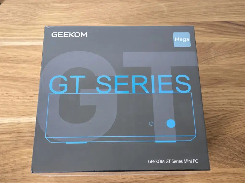 Pour ce modèle GT1 Mega, Geekom a réutilisé son style de packaging habituel pour les modèles de la série GT. Ici, la différence s'effectue avec la présence du logo "Mega" en haut à droite. La boite est aussi plus imposante que celles d'autres modèles de la série GT, car ce mini PC est plus grand : nous reviendrons sur ce point par la suite.