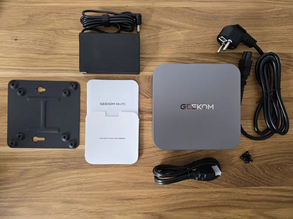 Nous bénéficions du panel d'accessoires « classique » auquel Geekom nous a habitués. La boite contient un câble HDMI, une alimentation externe et son câble, une plaque VESA (et les vis) permettant d'accrocher le mini PC à l'arrière d'un écran (support VESA) et une notice.
